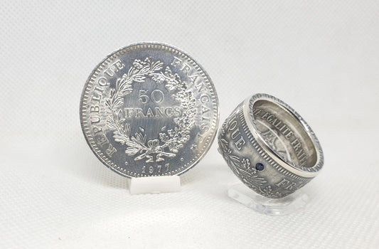 Bague pièce de monnaie 50 Francs Hercule en argent serti d'un saphir (coin ring)
