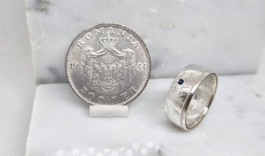 Bague pièce de monnaie 500 Lei Roumanie en argent serti d'un saphir (coin ring)