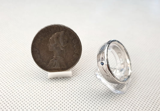 Bague pièce de monnaie 500 lires d’Italie en argent serti d'un saphir (coin ring)
