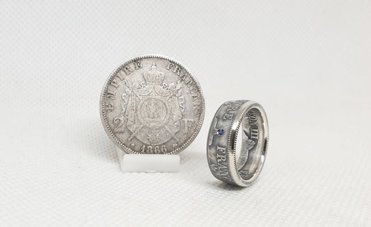 Bague pièce de monnaie 2 Francs Napoléon III visible en argent serti d'un saphir (coin ring)