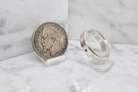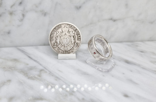Bague pièce de monnaie 2 Francs Napoléon III visible en argent serti d'un rubis (coin ring)