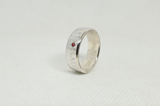 Bague pièce de monnaie 2 Francs Semeuse en argent style alliance avec gravure serti d'un rubis (coin ring)