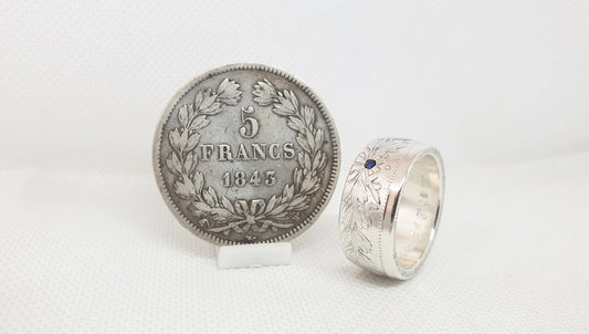 Bague pièce de monnaie 5 francs Louis Philippe en argent style alliance serti d'un saphir avec gravure (coin ring)