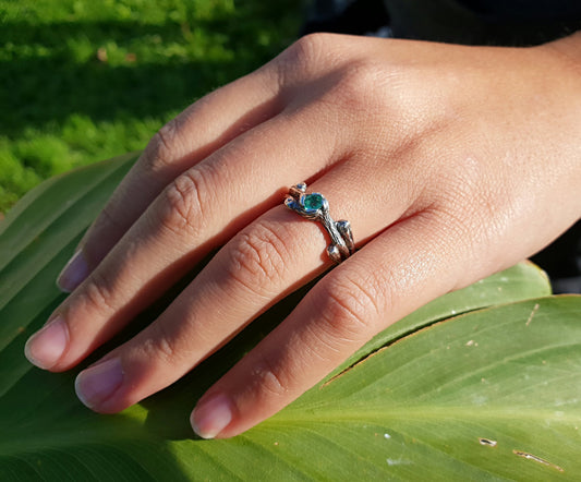 Bague brindille en argent et émeraude forgée entièrement à la main