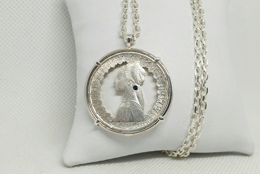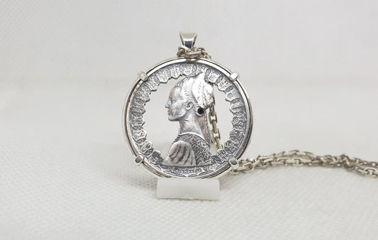 Pendentif pièce de monnaie 500 Lires Italie en argent fait main serti d'un saphir