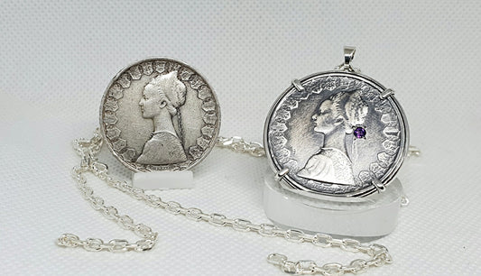 Pendentif pièce de monnaie 500 Lires Italie en argent fait main serti d'une améthyste