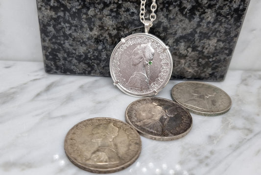 Pendentif pièce de monnaie 500 Lires Italie en argent fait main serti d'une tsavorite