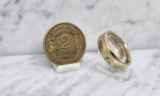 Bague pièce de monnaie 2 Francs Morlon serti d'une émeraude (coin ring)