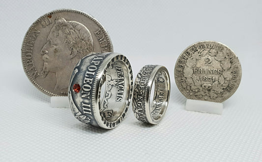Ensemble Bague pièce de monnaie 2 Francs Cérès et 5 Francs Napoléon en argent serti d'un rubis (coin ring)