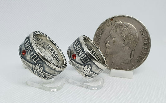 Ensemble Bague pièce de monnaie 5 et 5 Francs Napoléon III argent serti d'un rubis (coin ring)