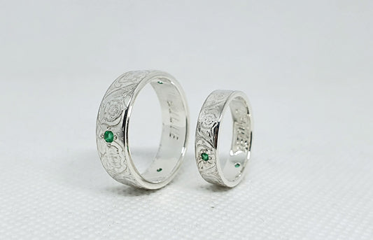 Ensemble bague pièce de monnaie 1 Rupee et un demi Rupee en argent style alliance avec gravure serti de trois émeraudes (coin ring)