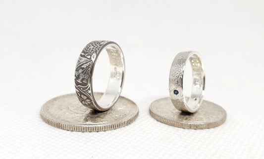 Ensemble bague pièce de monnaie 1 Rupee et un demi Rupee en argent style alliance avec gravure serti de trois saphirs (coin ring)