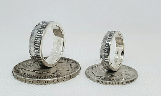 Ensemble bague pièce de monnaie 5 francs Napoléon III et 2 francs napoléon III en argent style alliance avec gravure (coin ring)