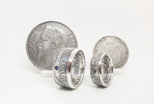 Ensemble Bague pièce de monnaie 5 et 2 Francs Napoléon III argent serti d'un saphir (coin ring)