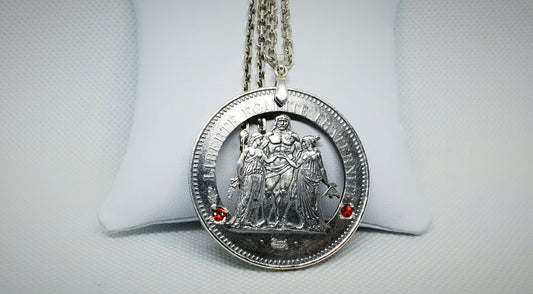 Pendentif pièce de monnaie 50 Francs Hercule en argent découpée à la main serti d'un rubis et d'un saphir