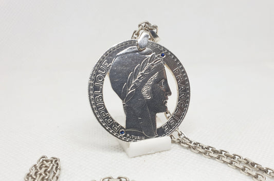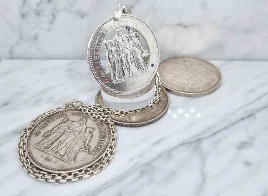 Pendentif pièce de monnaie 50 Francs Hercule en argent découpée a la main serti de deux saphirs