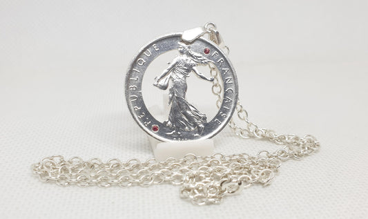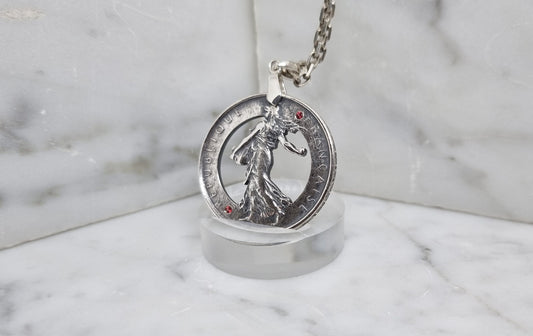 Pendentif pièce de monnaie 5 Francs "Semeuse" en argent découpée a la main serti de deux rubis.