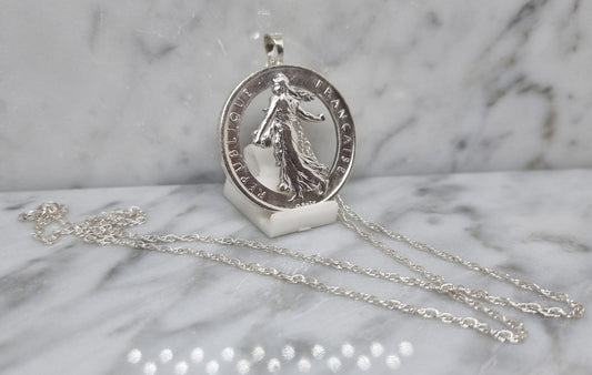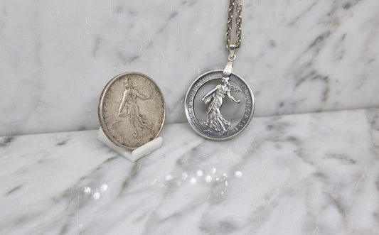 Pendentif pièce de monnaie 5 Francs" Semeuse" en argent découpée a la main.