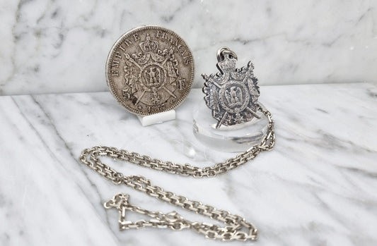 Pendentif pièce de monnaie 5 Francs Napoléon III en argent découpée à la main
