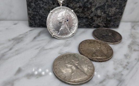 Pendentif pièce de monnaie 500 Lires Italie en argent fait main serti d'un saphir
